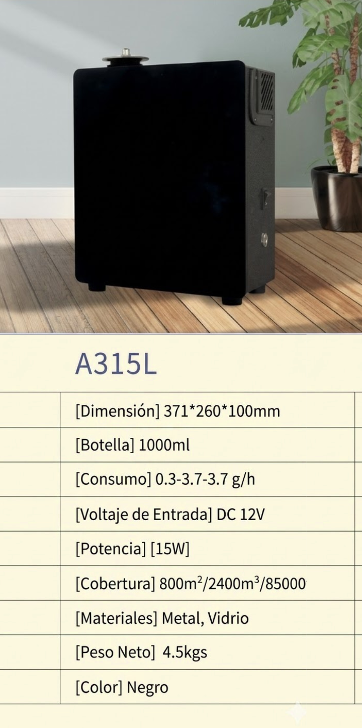 A diferencia de los difusores plásticos convencionales, este modelo (Versión L) está construido con materiales nobles que garantizan durabilidad y una estética superior. Su sistema de nebulización de doble fluido garantiza que la fragancia se mantenga pura, sin necesidad de agua, proyectando una niebla seca que se eleva y expande de forma inteligente por toda la estancia.