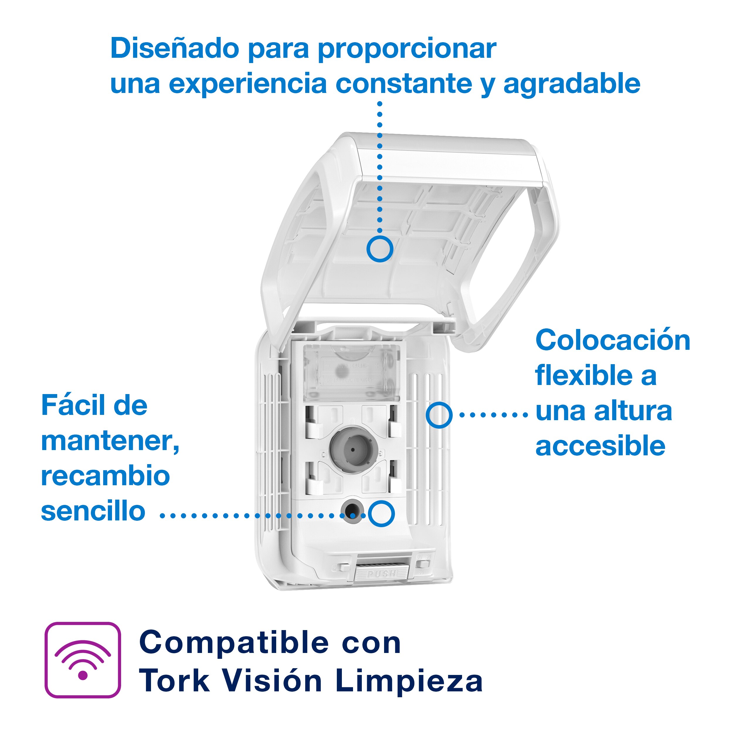 Además, este dispensador ambientador continuo cartucho ha sido diseñado pensando en la comodidad del personal de limpieza. A diferencia de los aparatos antiguos que obligaban a usar escaleras para instalarlos cerca del techo, este modelo ofrece un rendimiento óptimo montándose a una altura totalmente accesible. Así, los cambios de recambio se realizan en cuestión de segundos, sin esfuerzo y sin riesgos, ahorrando tiempo valioso en las rondas de mantenimiento diario.