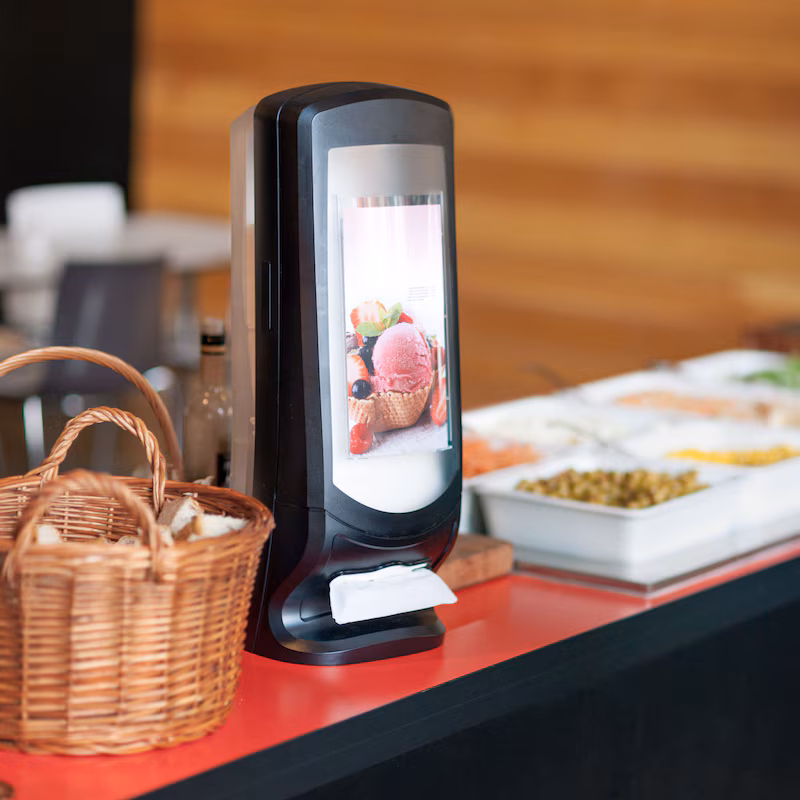 Marketing integrado: Cuenta con un panel lateral transparente personalizable para que insertes tus promociones, menús o códigos QR.