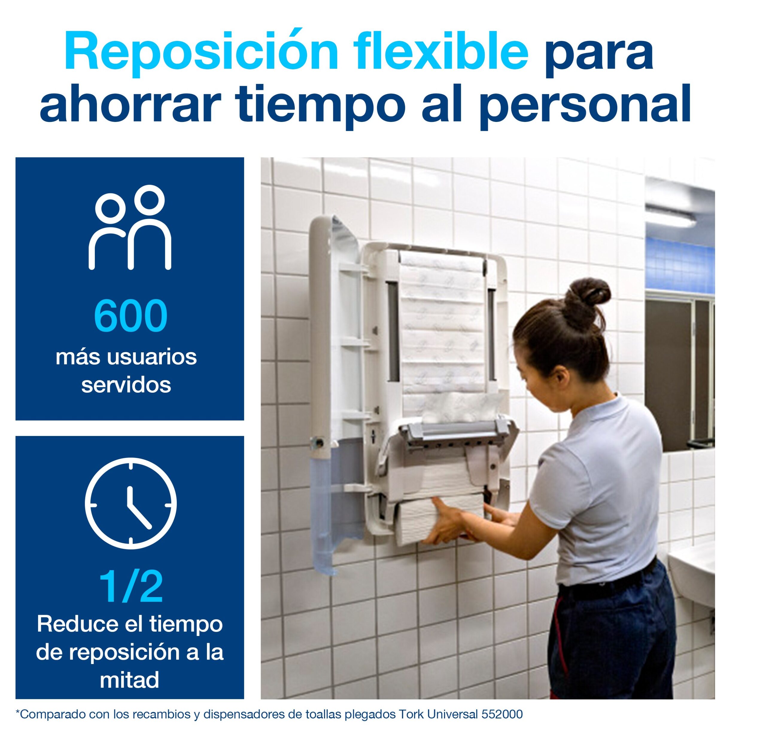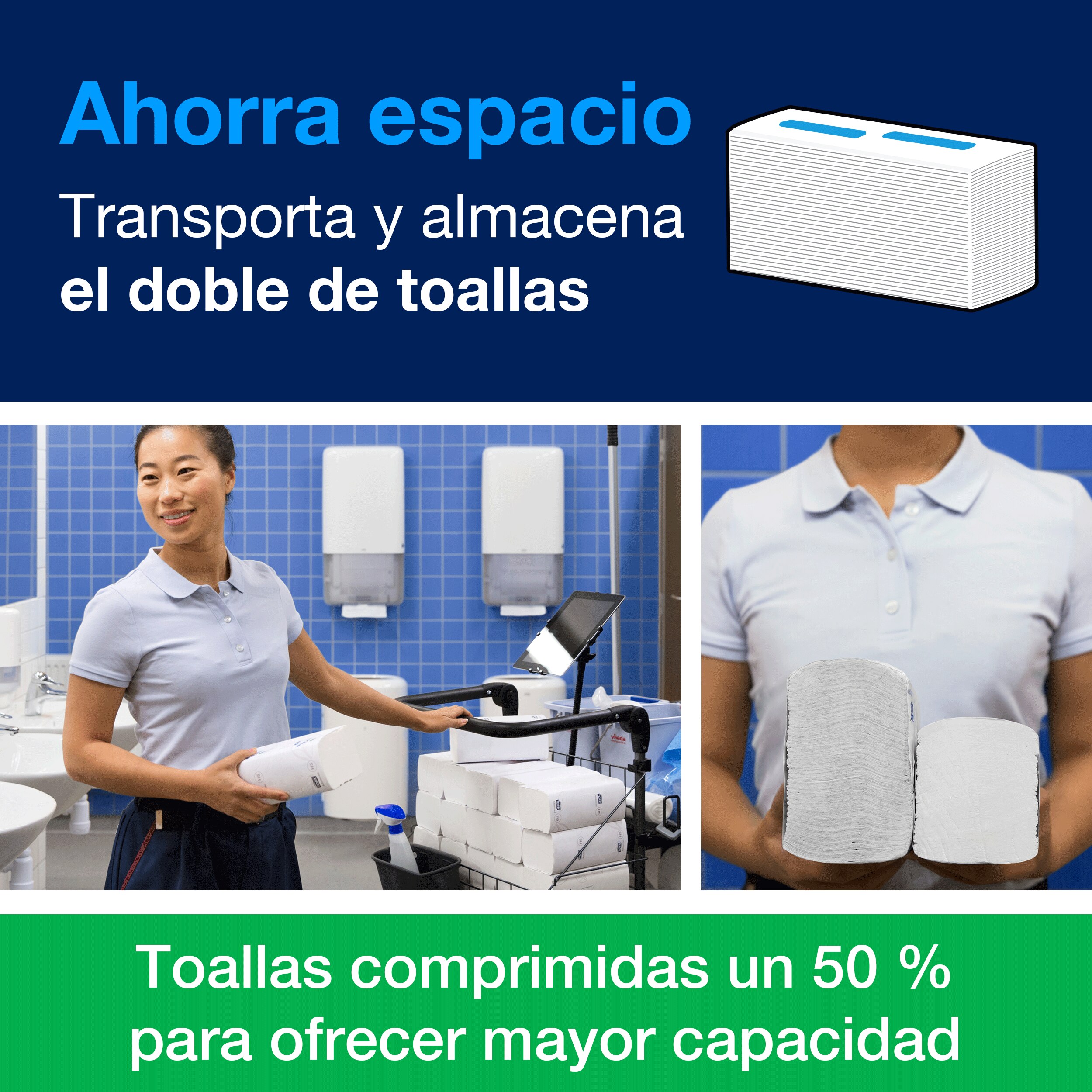 El gran valor de este producto no solo está en su rendimiento de cara al cliente, sino en el tiempo que ahorra a tu equipo de limpieza. Al estar fuertemente comprimidas, las toallas ocupan la mitad de espacio de almacenamiento, por lo que tus empleados pueden cargar el doble de recambios en su carro de limpieza.