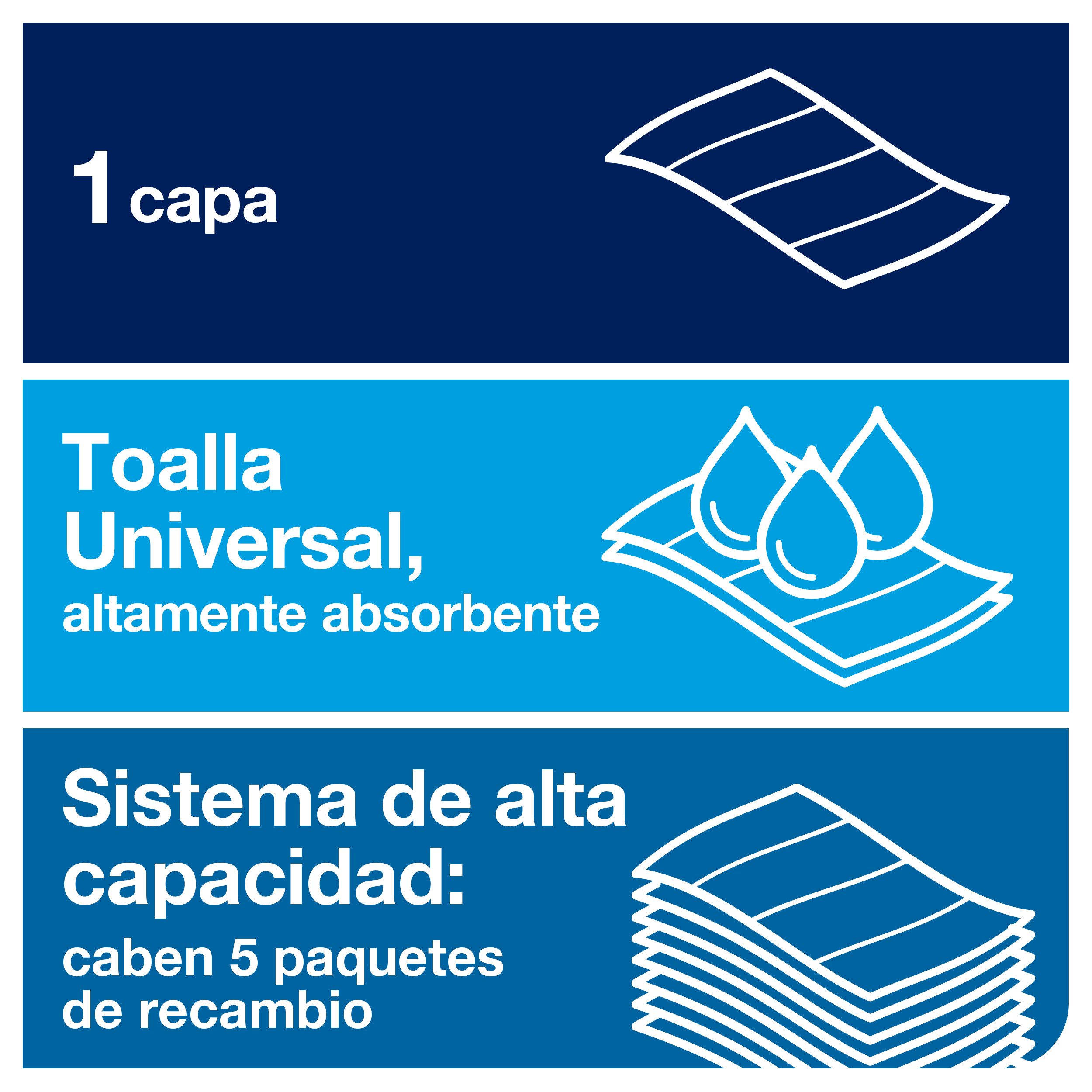 Alta velocidad: Facilita la extracción de una toalla en apenas 3 segundos, agilizando el tránsito de personas en las horas críticas.